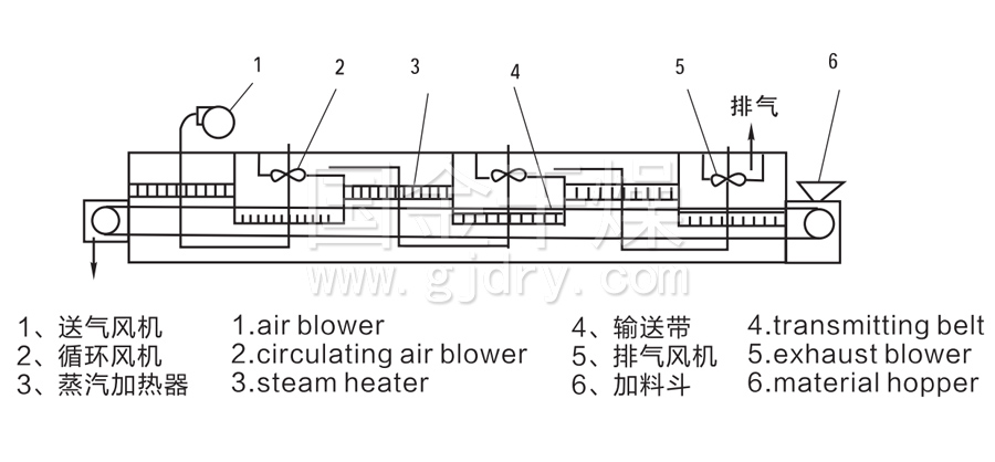 原理如圖所示,料斗中的物料由加料器(6)均勻的鋪在不銹鋼網(4)上,由傳動電機帶動網帶在干燥箱內勻速運動。干燥段由若干單元組成,熱風在兩個(或幾個)單元內橫向循環,新鮮空氣由風機(1)進入,通過換熱器(3)加熱,加熱空氣穿過物料層與物料熱交換,進入下腔,然后流向下一 單元,降溫后的熱空氣再經過換熱器(3)進行二次加熱,熱空氣穿透網帶與物料再次熱交換,濕熱空氣由排濕風機(2)(5)排出,完成干燥,每臺干燥機單元數可根據物料的特性、工藝要求選取。