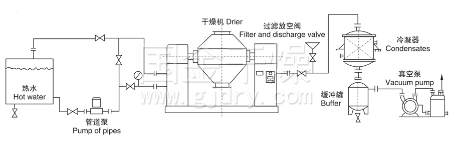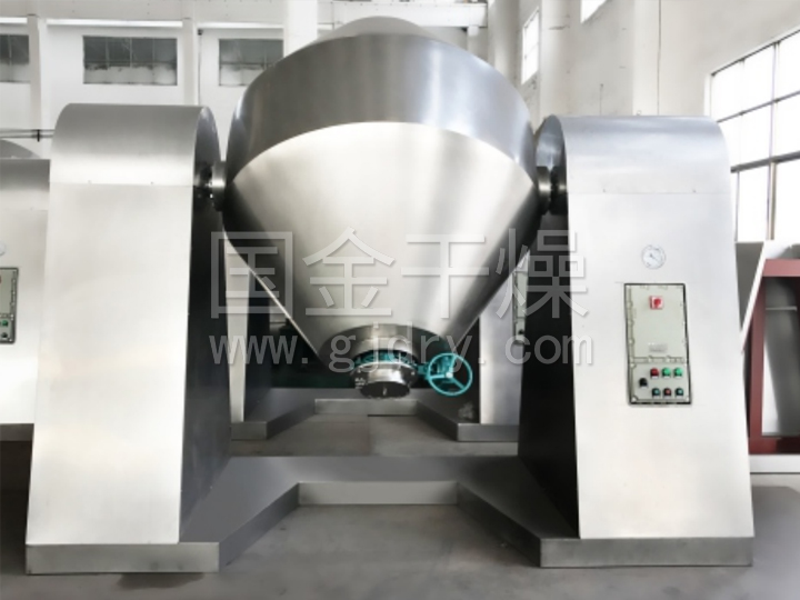 雙錐回轉真空干燥機是集混合—干燥于一體的新型干燥機。將泠凝器,真空泵與干燥機配套,組成真空干燥裝置。(如不需回收溶劑,冷凝器可不用)本機設計先進,內部結構簡單,清掃容易,物料能全部排出,操作簡便。能降低勞動強度,改善工作環境。同時因容器本身回轉時物料亦轉動,但器壁上不積料,故傳熱系數較高,干燥速率大,不僅節約能源,而且物料干燥均勻充分,質量好。可廣泛應用于制藥、化工、食品、染料等行業的干燥。