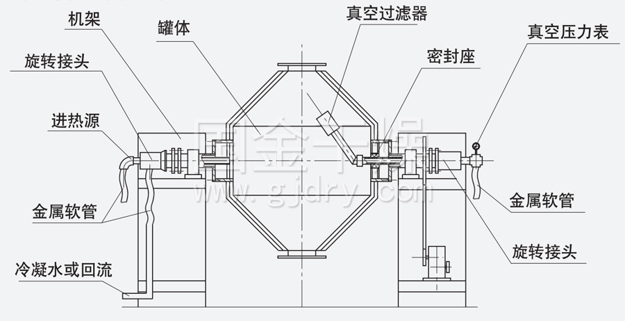 產品簡介:工作原理DCRD雙錐回轉真空干燥機為雙錐形的回轉罐體,罐內在真空狀態下,向夾套內通入導熱油或熱水進行加熱,熱量通過罐體內壁與濕物料接觸。濕物料吸熱后蒸發的水汽,通過真空泵經真空排氣管被抽走。由于罐體內處于真空狀態,且罐體的回轉使物料不斷的上下,內外翻動,故…